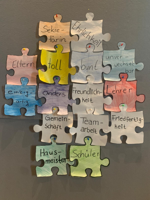 - Bei einem Puzzle darf kein Teil verloren gehen, sonst ist es unvollständig. Auch wir achten aufeinander, damit unsere Schulgemeinschaft komplett bleibt und niemand abgehängt wird oder sich alleine fühlt.